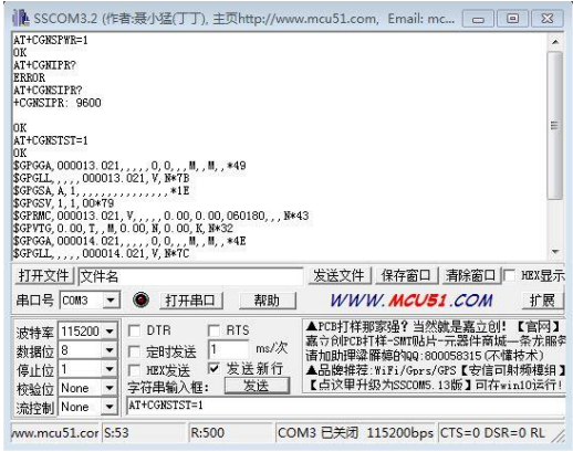 - 打开 GPS 数据流输出:AT+CGNSTST=1,得到定位信息,如下图所示